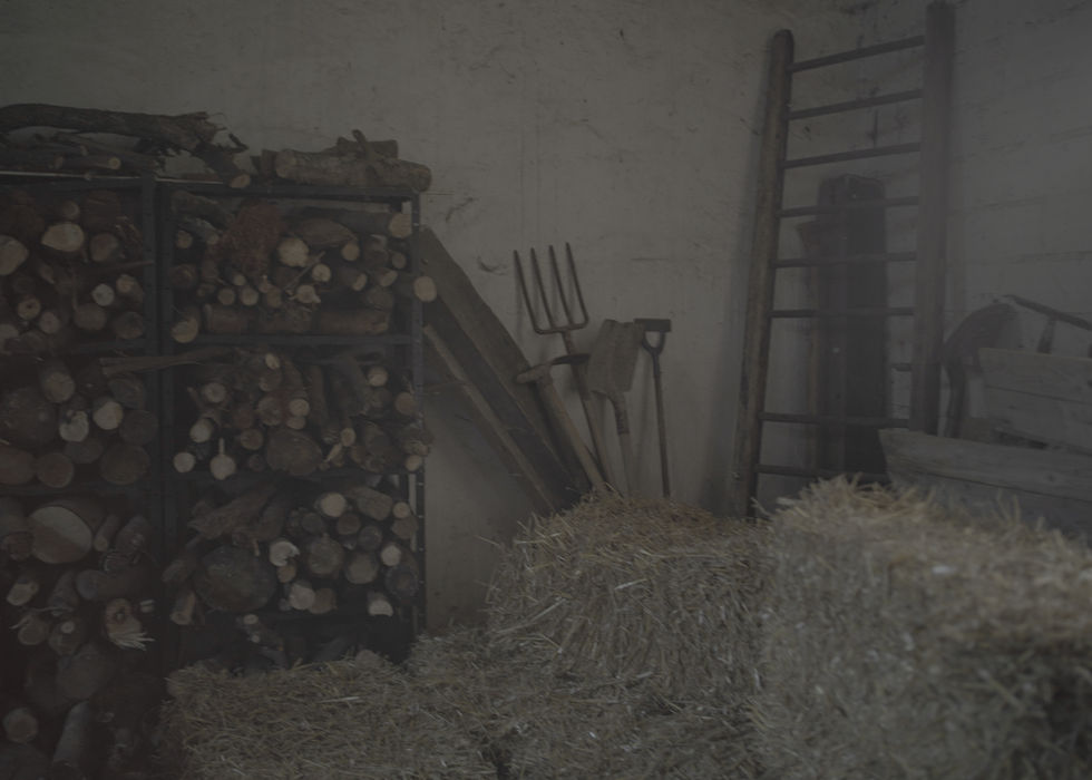 Nous avons déblayé la grange encombrée de matériel moderne, puis nous avons réutilisé les bottes de pailles de la guinguette, en avons ouverte certaines d'entre elle, et ajouté des outils de ferme et des lampes à huile.